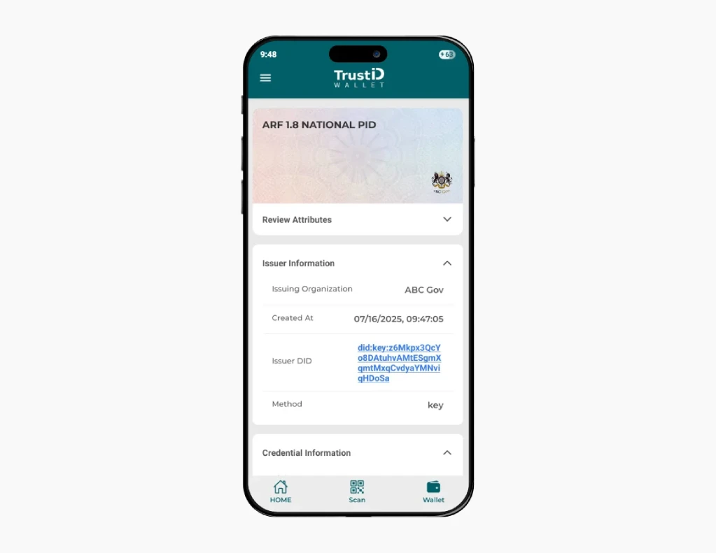 The wallet allows users to scan verification QR codes and present credentials for verification quickly and securely. This streamlines onboarding and verification processes, reducing friction for users and organizations.