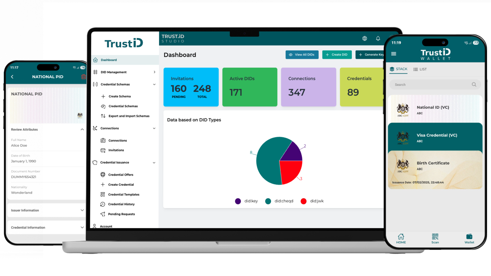 The TrustiD SSI Platform is DIT’s flagship product—a comprehensive, standards-compliant infrastructure for decentralized identity management. It is built on: